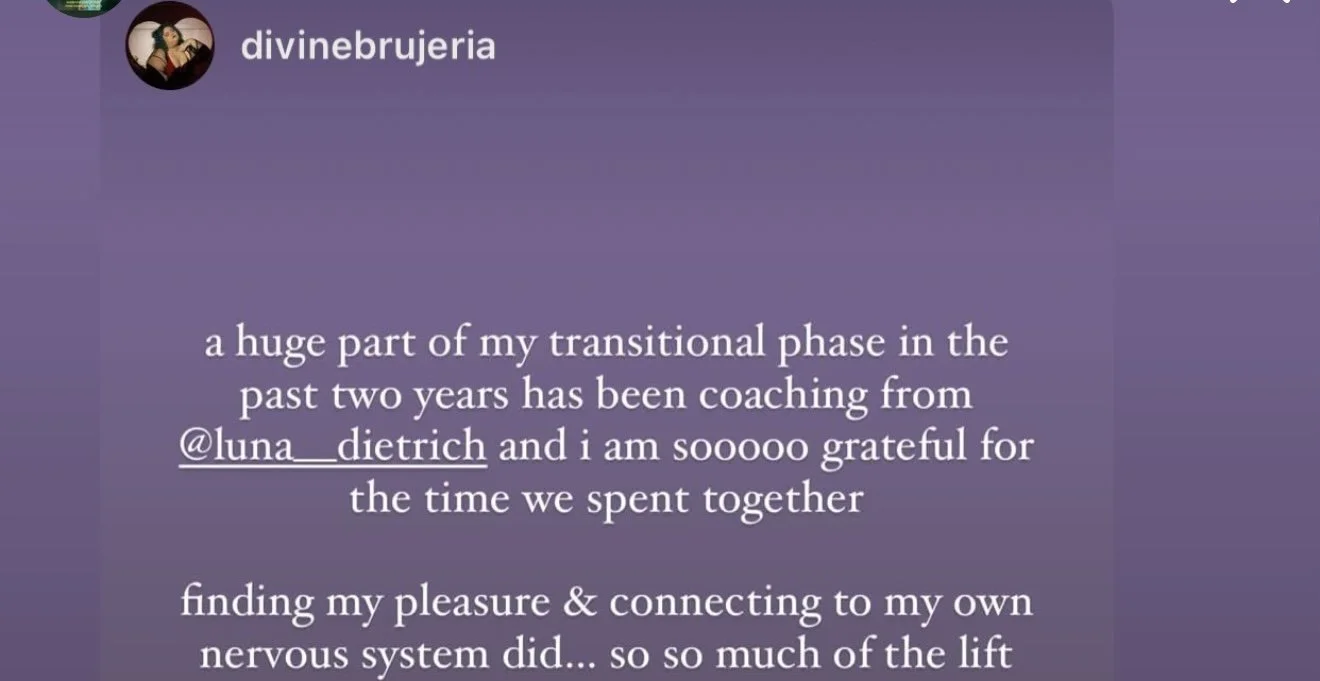 I started out as a pleasure educator and ecosexual, then became a business coach, and now weave somatics, trauma resolution, pleasure, animism, and deep nervous system work into everything I teach. For the past 5½ years I’ve lived on and stewarded 20 acres of land in Appalachia I’m stewarding, the land is my teacher as much as any lineage.