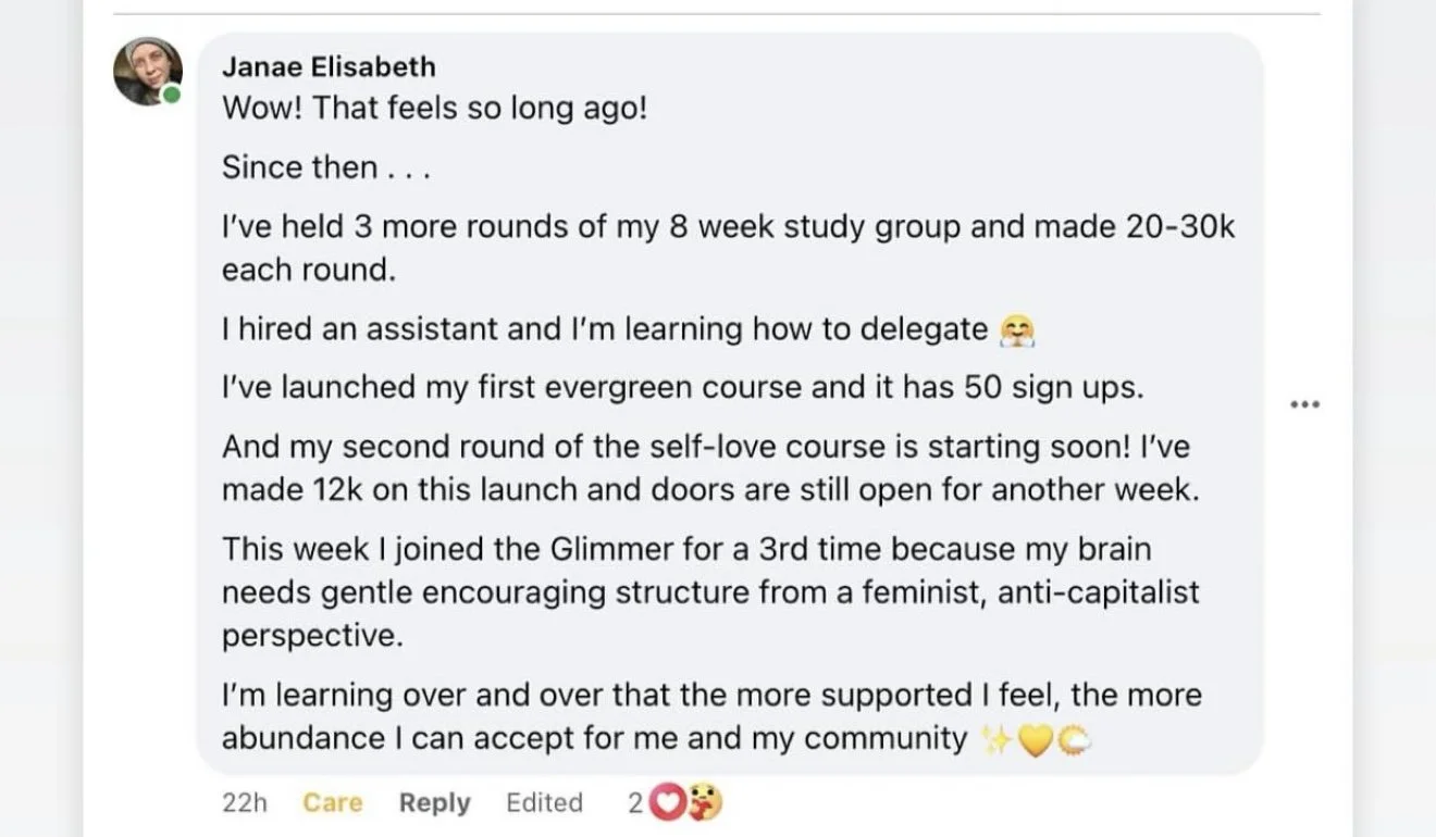 The Glimmer is a very small, intimate container. When you join, you're reserving one of only 15 spots and committing to the full duration of the program.
